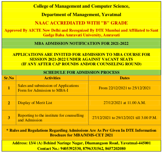 APPLICATIONS ARE INVITED FOR ADMISSION TO MBA COURSE FOR SESSION 2021-2022 UNDER AGAINST VACANT SEATS
